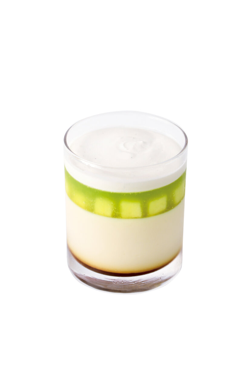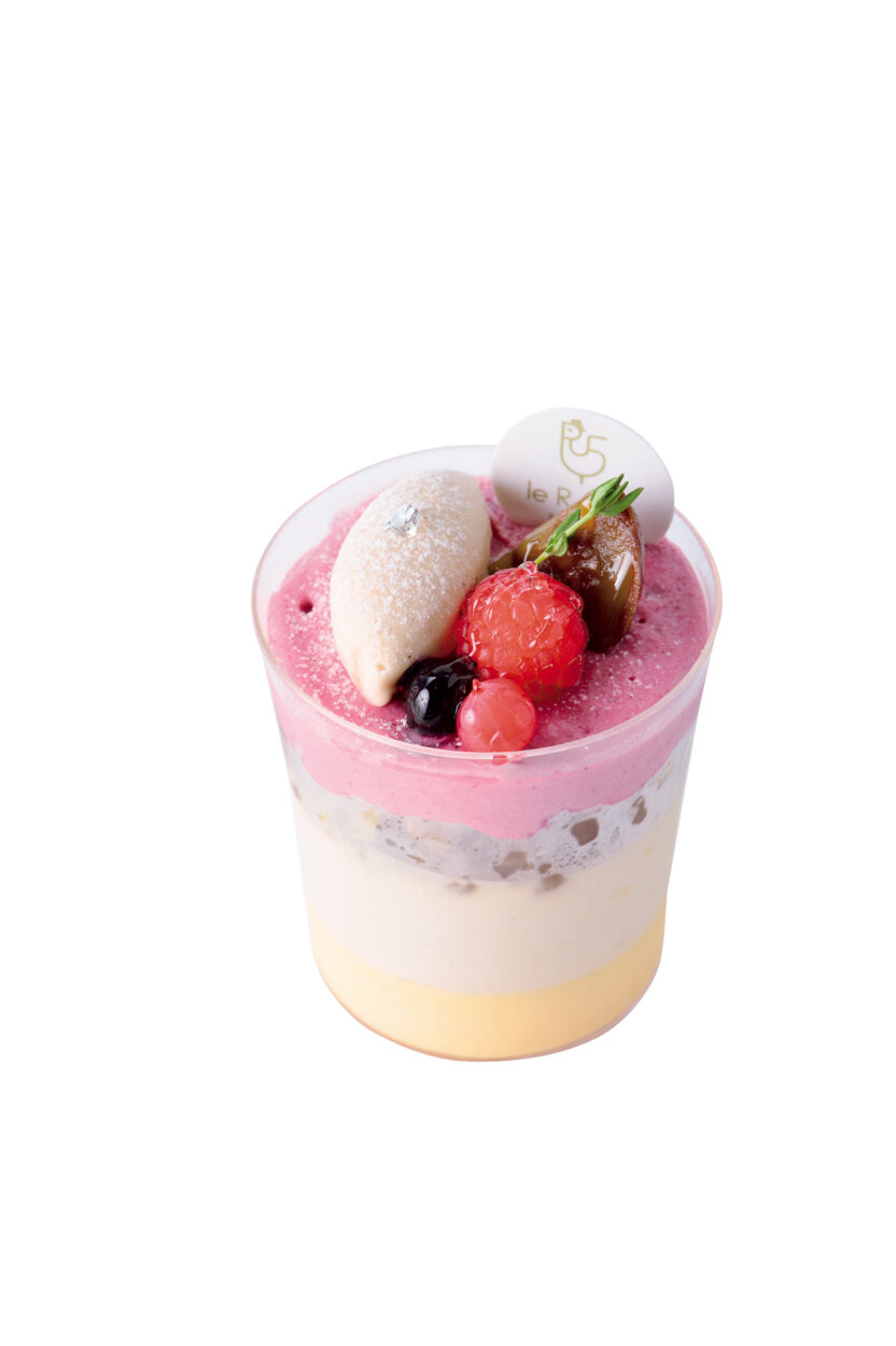 たっぷりのメロンとマスカルポーネクリームが絡み合い、濃厚な甘みが生まれる。続くエルダーフラワーのジュレはライチ果肉入りで、プルンとした質感が魅力。それぞれの層が混ざり合えば一層豊かな味わいに。
