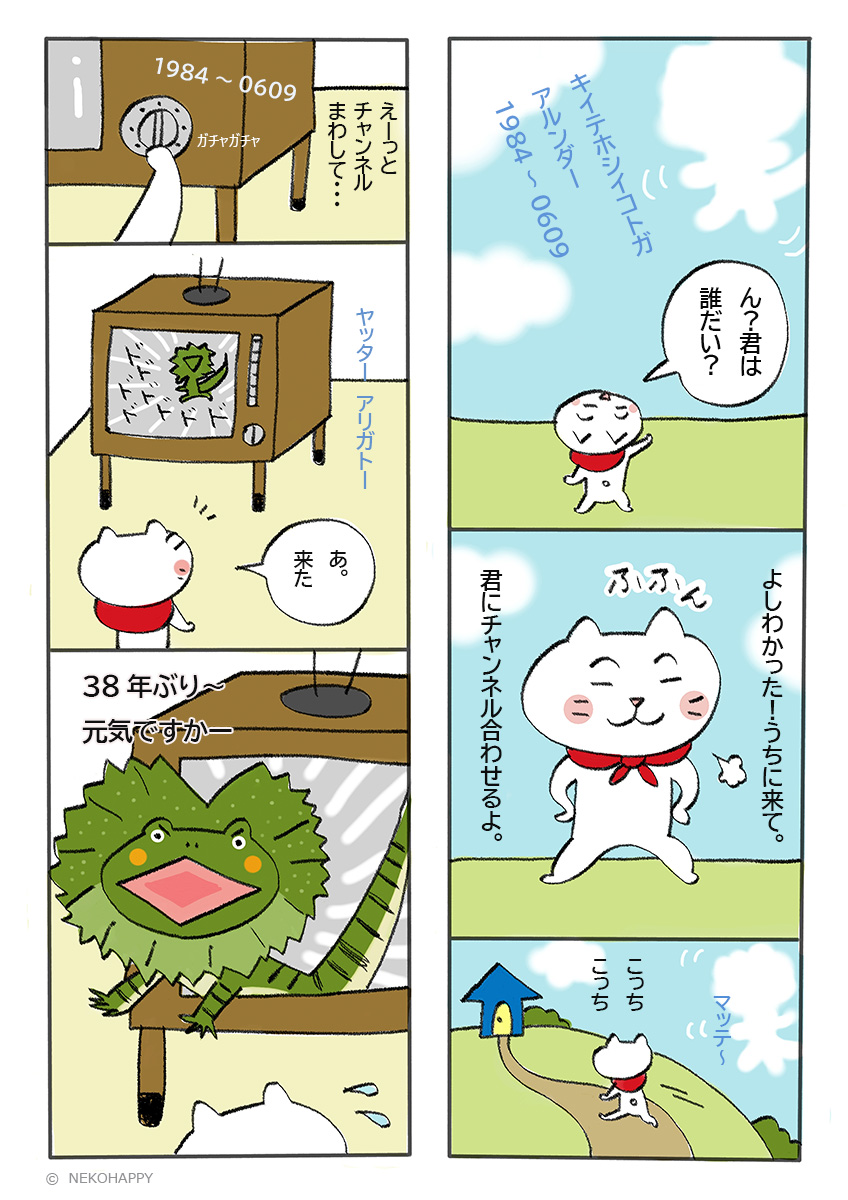 満吉(まんきち)くんは、各時代で話題となった存在と、時空を超えて交流できるという特殊な能力を持つ猫。この愛くるしいキャラクターの生みの親、マルチクリエイターの江戸家猫ハッピーさんが、満吉くんを主人公にした漫画で心が和らぐ物語を紡ぎます。今回は「エリマキトカゲ」編です。