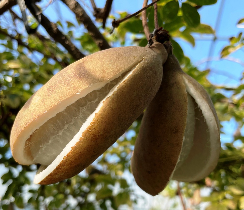 春には淡紫色の花を咲かせ、秋になると楕円形の果実を実らせます。一般的なものは紫色の果皮を持ち、熟すと自然に縦に裂けて、白くて甘い果肉が顔を出すというユニークな姿が特徴です。