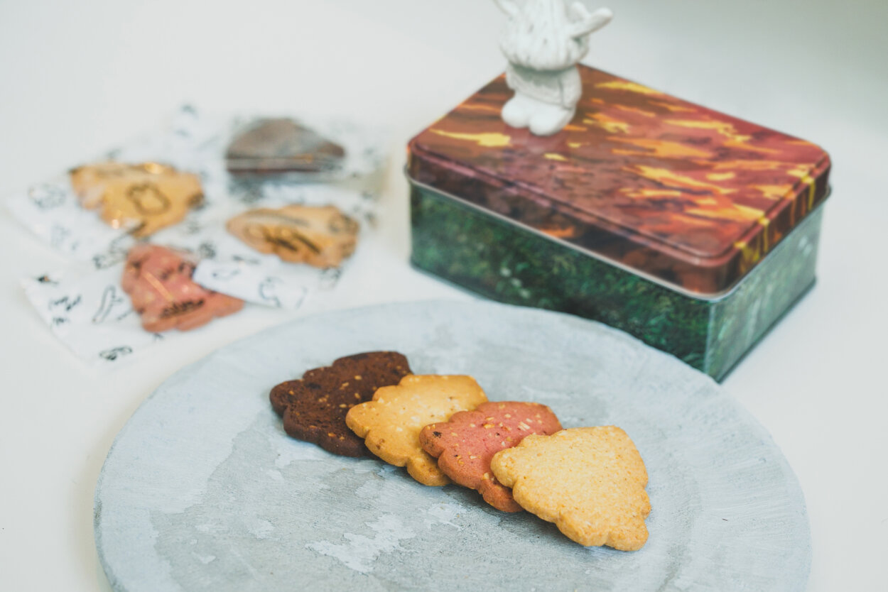 岡山県立美術館、QINOCO RSK、白十字 一番街店の3店舗限定では、平子雄一と白十字のコラボクッキー缶「Sweet Tree」も販売中です。平子雄一が新たに制作した作品を元にデザインしたオリジナルデザインの缶に、平子雄一が監修し、白十字で製造したチョコレート、バターソルト、ベリー、ココナッツの4種類の個性豊かなクッキーが詰め合わされ、見た目も味わいも楽しめる逸品です。