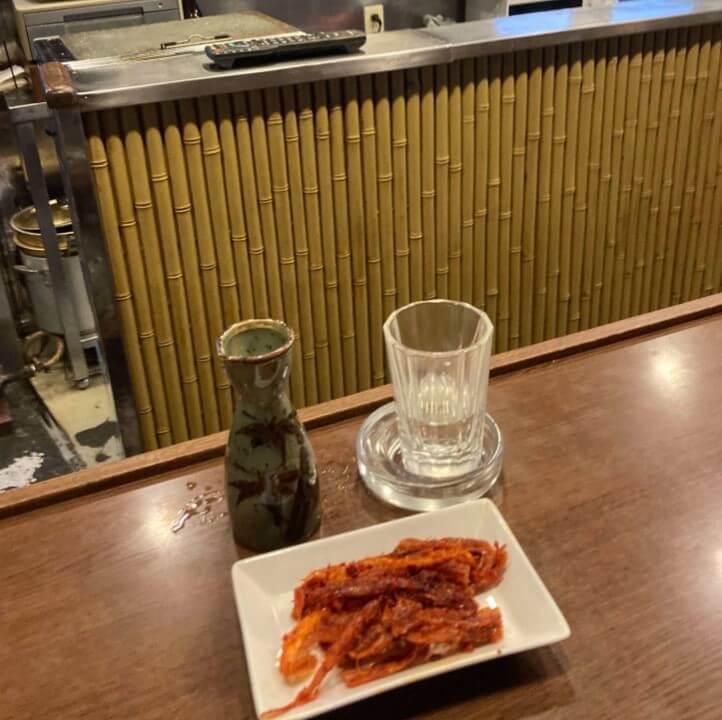 基本的に韓国料理が多いようです。「はい、めんたい」と最初に出てきたのはどうも魚のキムチ?。常連客の会話を聞いていると、スケトウダラ(明太子の親魚)のピリ辛のようです。明太子の親だから「めんたい」か。びっくりしました。スルメのようなコリっとした触感と辛みがよく合います。