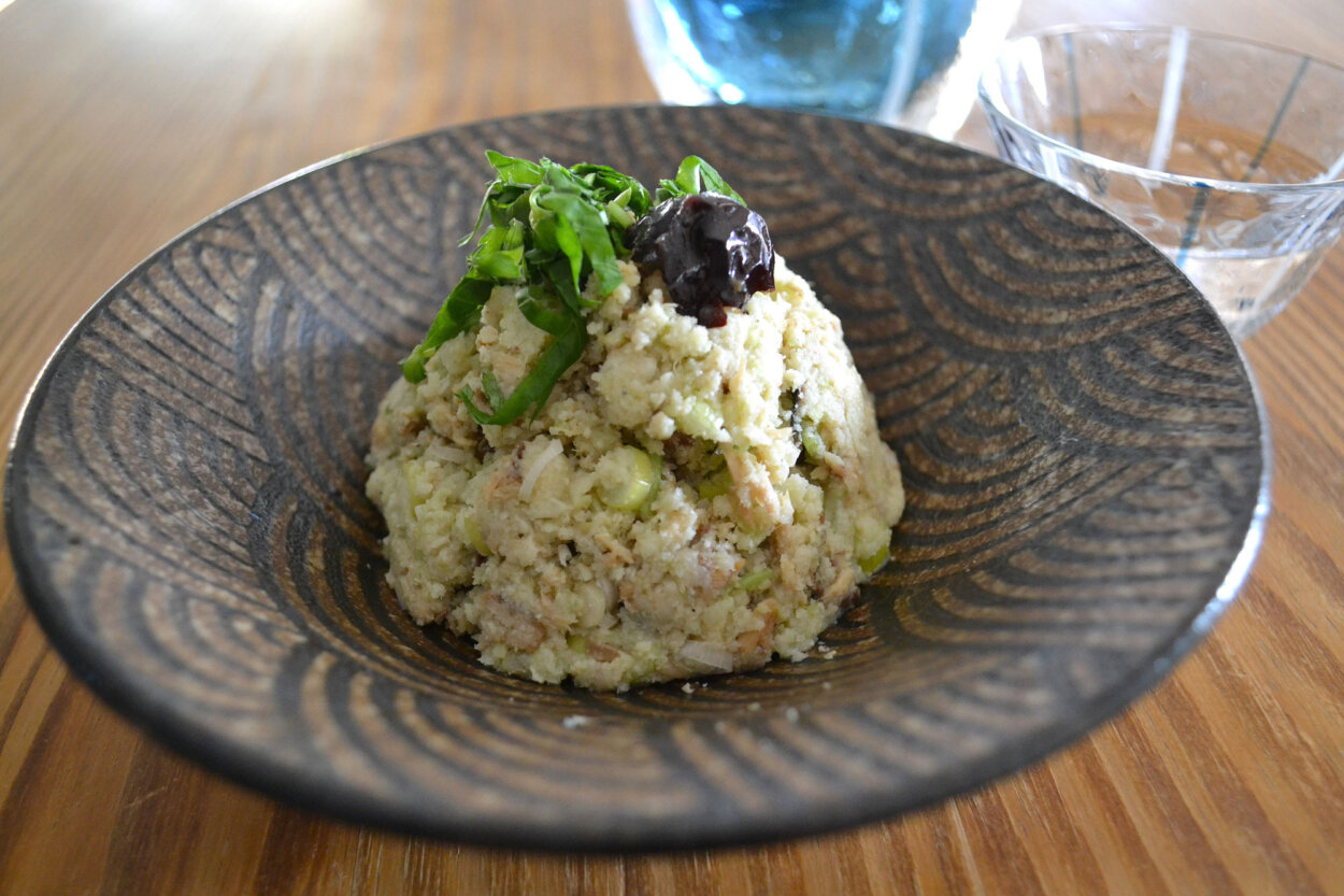 「料理に寄り添う酒であること」を信条に醸された「遊穂」。上品な米の香り、口当たり柔らかく角のない丸い旨みがあり、どこまでも飲み続けられる純米酒です。なつめサバのおからと一緒に口に含むと、『遊穂』の上品な米の香りと旨みと酸みが一体となり、相乗効果で味わいをさらに増幅させます。甘・酸・辛・苦・渋の五味が口中に広がります。ぬる燗がおすすめ」(貴司さん)