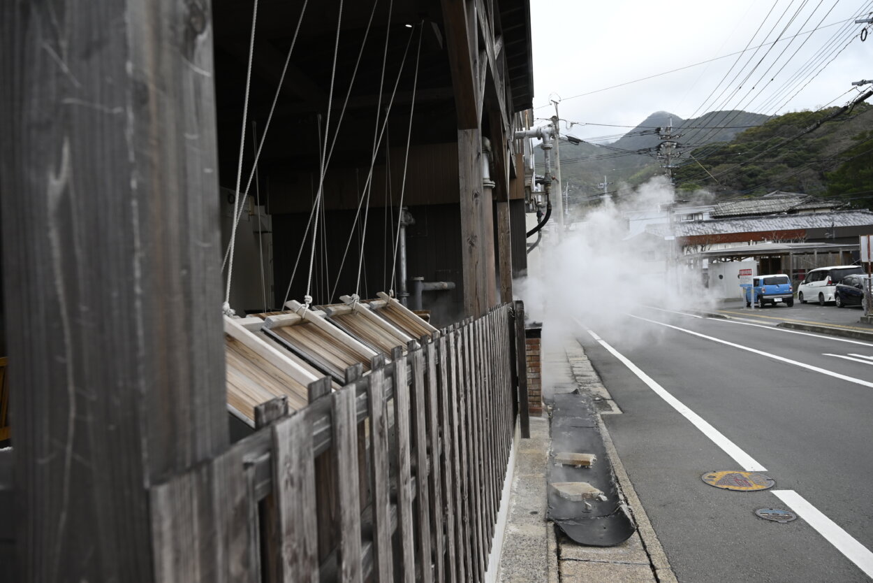 小浜温泉の源泉は約30カ所ある。各宿がそれぞれ源泉を所有しているほか、飲食店や広場でも「蒸し釜料理」を味わうことができる。