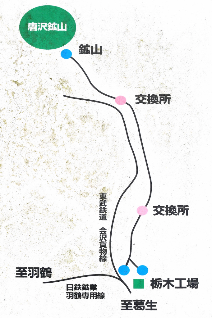 旧葛生町の築地地区にある住友セメント(現・住友大阪セメント)栃木工場と3.3km離れた「唐沢鉱山」を結んでいた小さな鉱山軌道があった。1938(昭和13)年に開業したこの路線は、黄色い車体のガソリン機関車が、石灰石を積んだ見るからに重そうな鉱車(貨車)を10両連結して運行していた。レールの幅は、JRなどの通勤電車に見られるような1067mmではなく、ナローゲージと呼ばれる762mmと小柄なものだった。