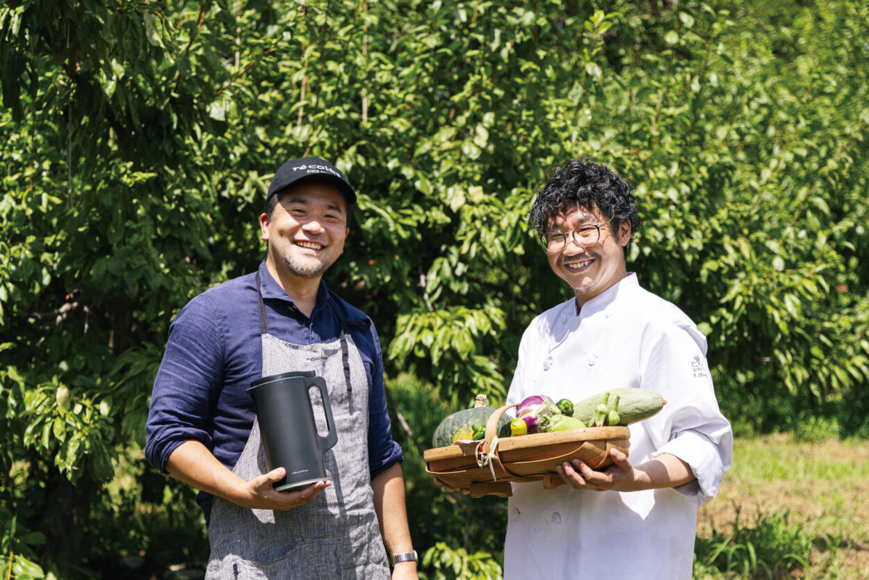 レコルトの猿渡進悟氏と「オステリアグラヴィーノ」緒続文一シェフ。生産地の食材を生かすことを使命とするシェフの導きで山梨の農園を訪れたことが、レコルトに食材を見つめ直す視点をもたらした。