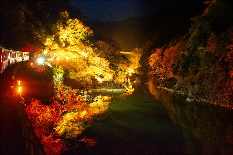 場所:トロッコ嵯峨駅~トロッコ嵐山駅~トロッコ保津峡駅~トロッコ亀岡駅間 ※ライトアップはトロッコ嵐山駅~トロッコ亀岡駅間
