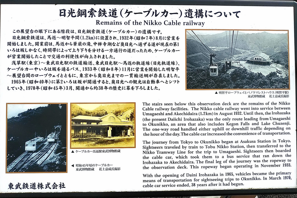 第ニいろは坂(上り)には、駐車場を兼ねた展望台が2箇所あり、黒髪平と明智平がある。黒髪平の“黒髪”とは、日光国立公園に属す「男体山」のことで、古くは松尾芭蕉の“奥の細道”に「黒髪山は霞かかりて雪いまだ白し」と記される。いっぽうの明智平は、後述するケーブルカーの終点駅があった場所だ。