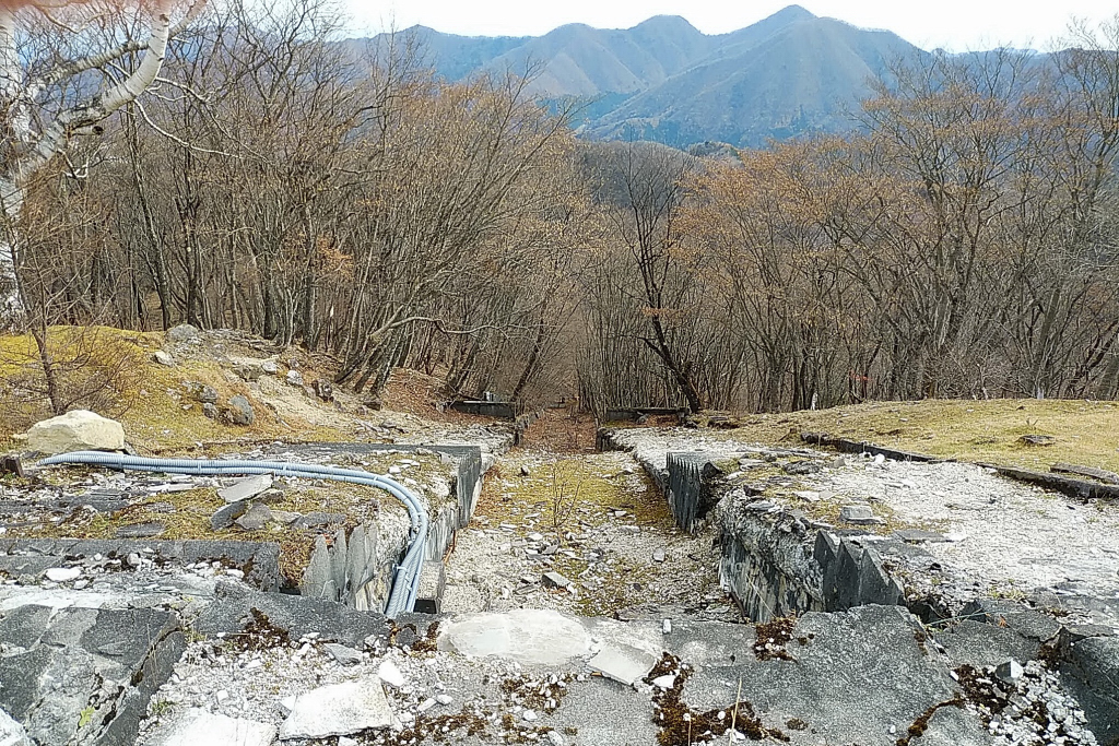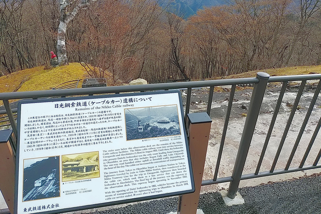 ※トップ画像は、第ニいろは坂(国道120号線)の途中2箇所にある駐車場のひとつ「明智平」にあるケーブルカー遺構(日光鋼索鉄道線)明智平駅跡=2019年11月18日、日光市細尾町