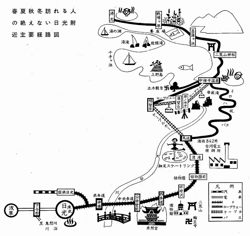 紅葉の名所として知られる栃木県の日光国立公園にある中禅寺湖。最寄りの日光駅までは、東武特急で東京の浅草駅から2時間弱で到着する。日光市内からは、路線バスやクルマで「いろは坂」を経由して行くのが一般的だ。しかし、1960年代まで日光駅から中禅寺湖畔へは、東武鉄道が運営する路面電車、ケーブルカー、ロープウェイと乗り継ぐ、全長約12kmの観光路線網が存在した。現在は、その一部区間となる明智平(あけちだいら)ロープウェイが営業するのみだが、今でこそ存在していたら人気の観光ルートになっていたに違いない。わずか8年間という短命に終わった観光路線網の歴史を振り返ることにしたい。