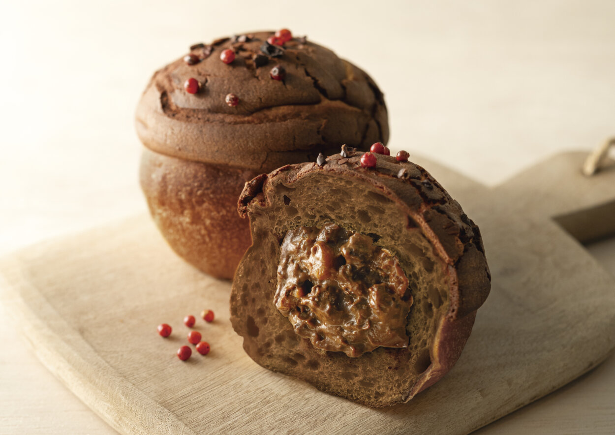 限定メニューの「ショコラティエのビーフシチューパン」(464円)は、ココア生地の“帽子”をかぶったユニークな惣菜パン。隠し味にチョコレートを加えた特製ビーフシチューを、ふわふわのパン生地で包み、ピンクペッパーとカカオニブでアクセントを添えています。深みのあるコクとまろやかな味わいが特徴です。