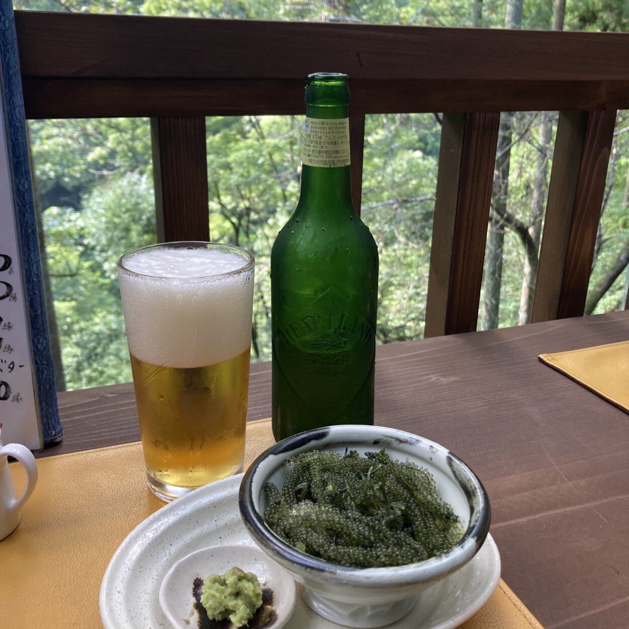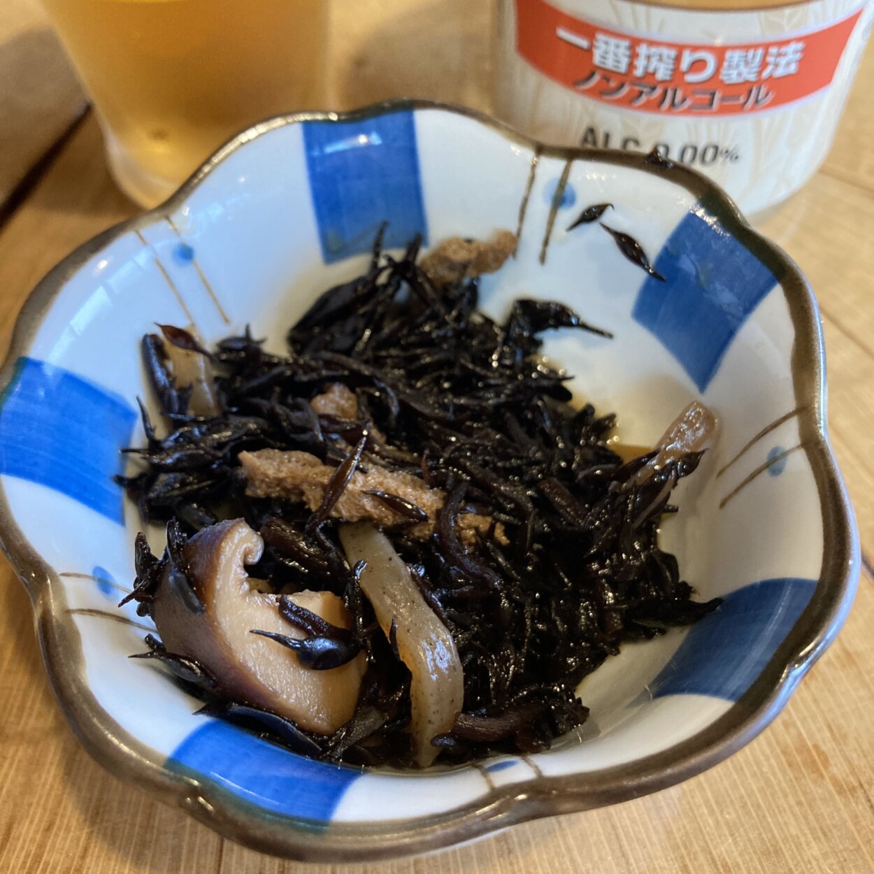 お店はまさに奥多摩湖の周遊道路沿いにあります。1階は数台停められる駐車場(すぐ近くにも駐車スペースあり)で、階段を上がった2階が食堂になっています。当日も満席で相変わらず人気があるお店です。メニューは食堂そのもの。おでんからカレーにチャーハン、かつ丼、そば類と何でもあるお店ですが、大半の方が注文するのがやはり「手打ち中華そば」です。筆者が頼んだのはノンアルビールともちろん「手打ち中華そば」。ノンアルにはホカホカの「ひじき」が着いてくるとは嬉しいですね。
