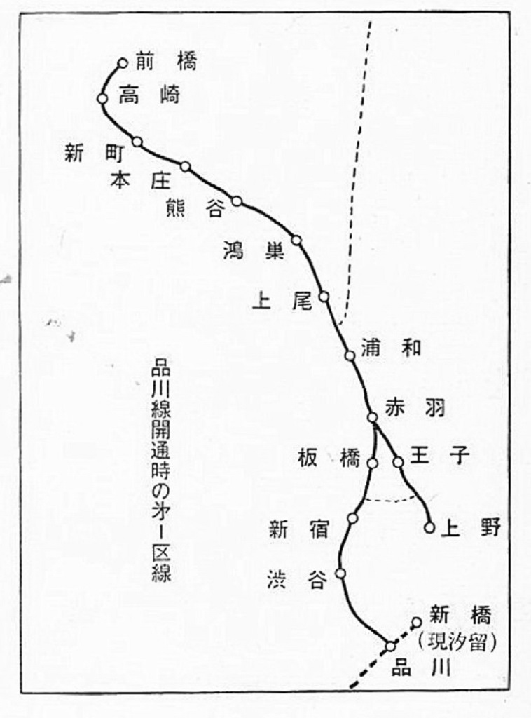 品川線は、品川駅(港区)から目黒駅、渋谷駅、新宿駅、目白駅、板橋駅を経由し、赤羽駅(北区)とを結んだ。品川駅では、先に開業していた官設鉄道の新橋駅(のちの汐留駅)まで乗り入れを行った。当初は、新橋駅と赤羽駅の間を1日わずか3往復しか列車がなかった。この路線に1887(明治20)年、当時7歳だった大正天皇が乗車した記録が残されている。新橋駅から“臨時列車”(汽車)で赤羽駅を経由して上野駅まで、「郊外の光景」を車窓から楽しまれたという。