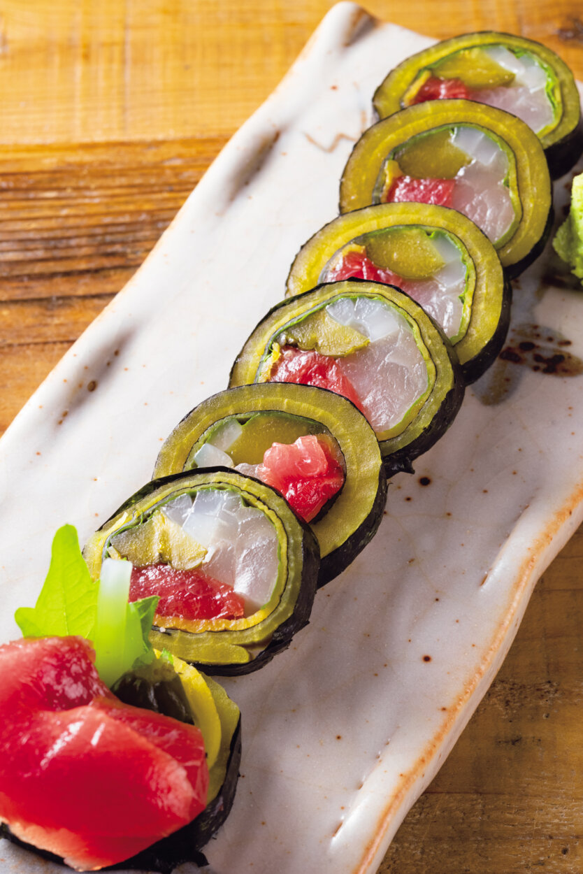 黒、黄、赤、白。美味なる調和は大将・野中匠さんのなせる技。上質の海苔とたくわんで、きゅうりの糠漬けや山ごぼう、マグロやタイなどを巻く。その時々で具が変わるのもまた楽しみ。