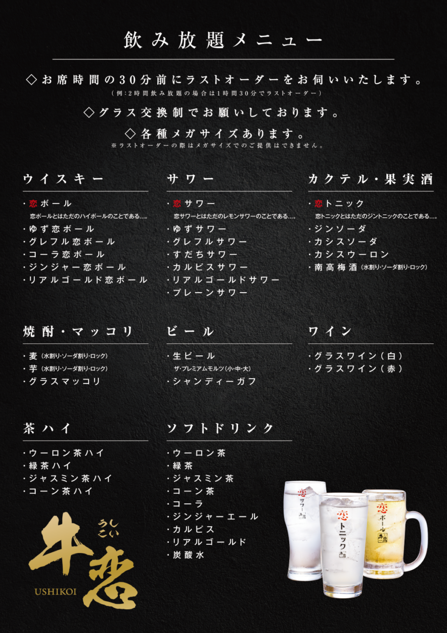 いずれも『牛恋』が誇る赤身肉の旨さを堪能できるプランで、120分飲み放題(90分L.O.)がセットになっている。気軽に楽しめるお手頃コースから、贅沢な厚切り赤身や希少部位を含むプレミアムプランまで、予算や好みに合わせて選べるのが魅力的だ。