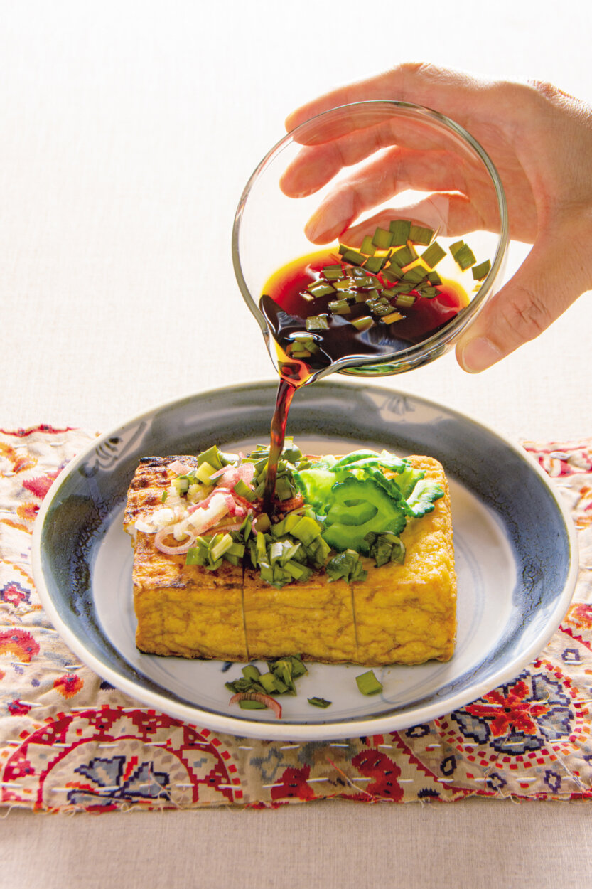 居酒屋メニューにもよくある厚揚げ焼きは、家だとなぜか単調な味に感じる……。そんなとき、ニラ黒酢+醤油の出番です。これだけで味わい深くなり、黒酢効果で食べ飽きない。たとえ薬味がなくとも、ニラで効果は充分です。