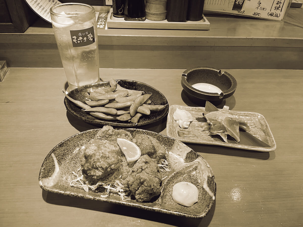 ツマミは鶏の唐揚げがやっぱ不動の人気。あとホッケが北海道の味的にこの頃からメニューに登場。値段の割に量が多く、これ一品でけっこう飲めるのでよく頼んだ、オレは。