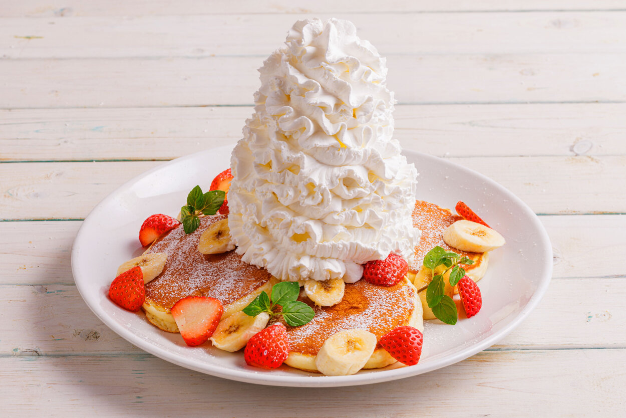 中でも、ストロベリーとバナナを贅沢にトッピングした「ストロベリー&バナナホイップパンケーキ」は、見た目も華やかな人気メニュー。