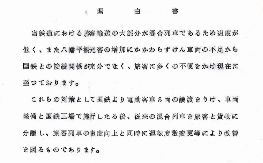 1929(昭和4)年には、鉱石輸送量の増加と効率化を求め、動力を馬から瓦斯倫車(ガソリンカー)に切り替えた。その後も1934(昭和9)年になると、さらなる鉱石輸送量が増加したため、蒸気機関車による輸送へと切り換えることを計画した。このためには、「専用鉄道」として、国(監督官庁)に届け出る必要が生じた。