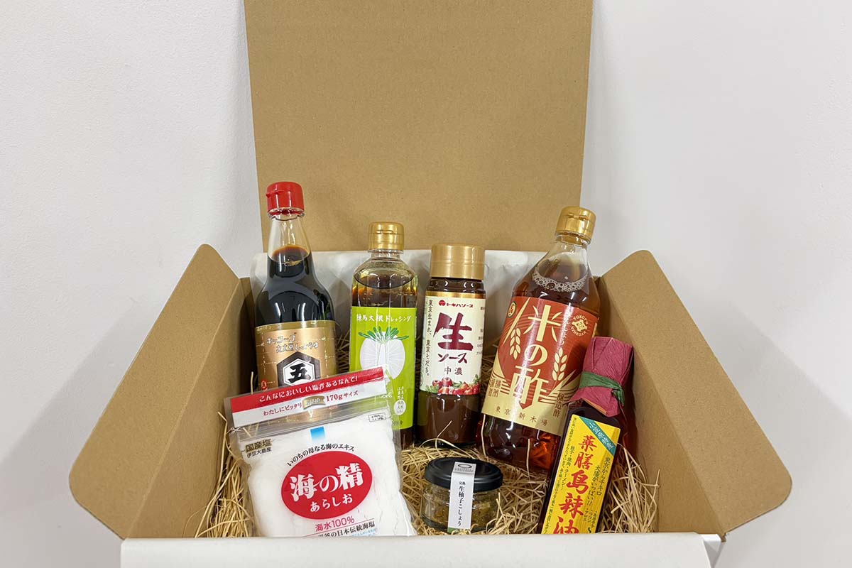 その他に【北区】生ソース(中濃)、【江東区】きんしょう米の酢、【あきる野市】丸大豆醤油、【伊豆大島】海の精あらしおといった東京の魅力を味わいで楽しむ7種類の調味料を詰め合わせています。