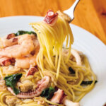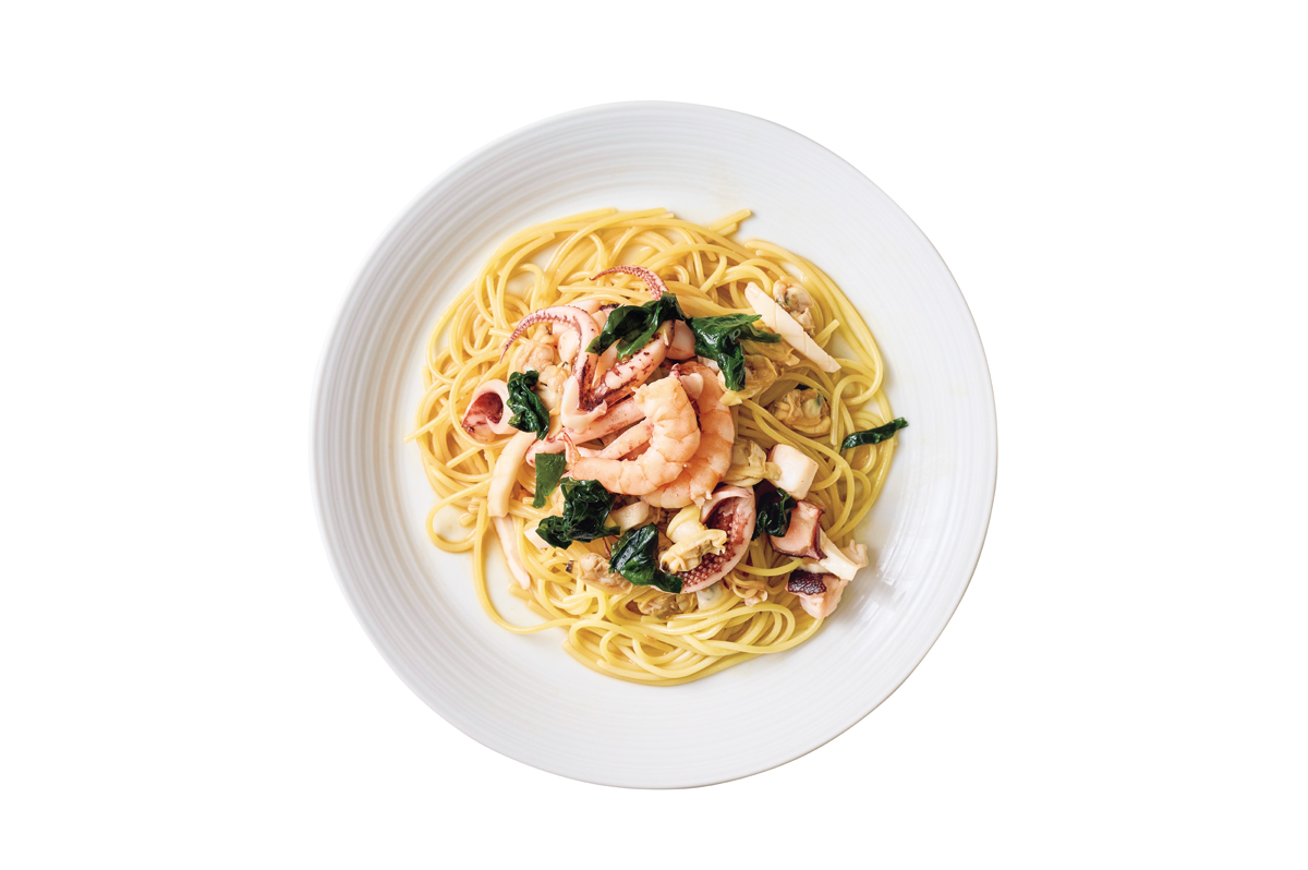 『松下雄二屋』海の幸スパゲティ(おしょうゆバター) 1600円 イカ、タコ、エビ、アサリ、ワカメと具材たっぷり