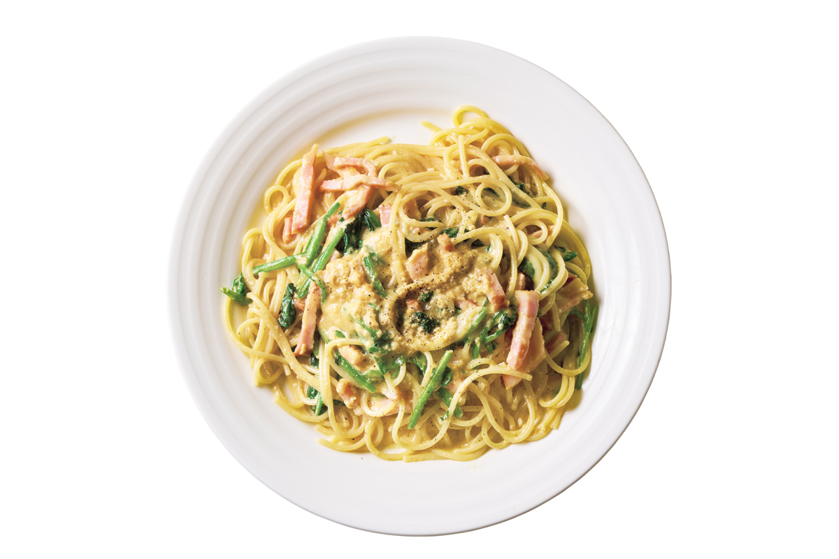 『トレッテ三軒茶屋』和風カルボナーラ 1250円 ほうれん草トッピング +100円 オススメトッピングはほうれん草