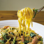 この繊細なソースに合わせるのは、アルデンテに茹でた1.7mmのパスタ。これもまた日本の食卓ではお馴染みの選び。
