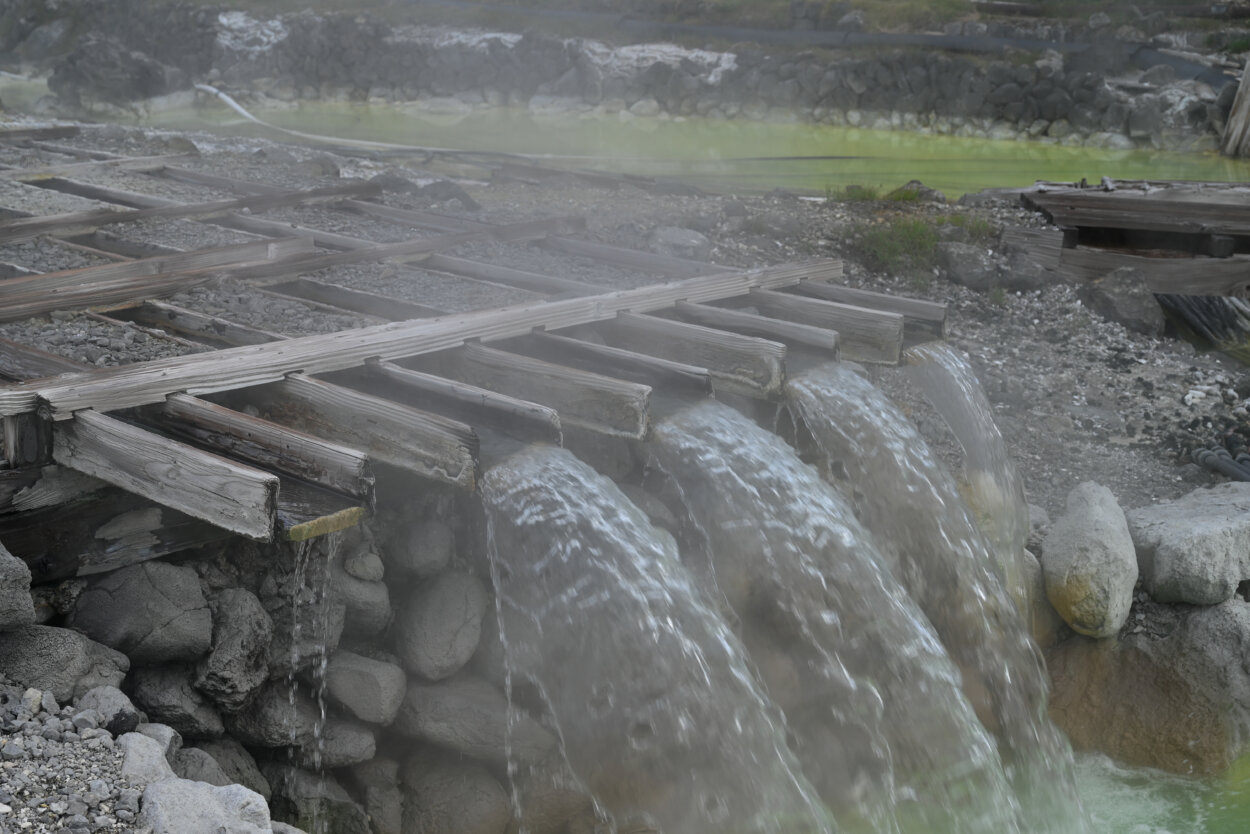 98℃の源泉が湧き出す「大噴(おおぶき)」では、ボコッ、ボコッとものすごい量の熱泉が湧き上がっていて、感動する。酸性・含鉄(II)・硫黄・二酸化炭素−アルミニウム−塩化物泉という温泉が毎分9000リットルも自然湧出している。これは1カ所からの湧出量としては、日本一だという。