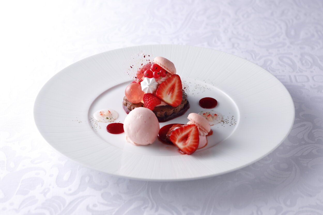 ふたつ目は、「九州産の苺“恋みのり”とルビーチョコレートのタルト仕立て」。ベリーのジュレやルビーチョコレートのクリームでまとめたタルトに、自家製サングリアでソテーした“恋みのり”、軽やかなマカロンとルビーチョコレートのアイスクリームが添えられています。