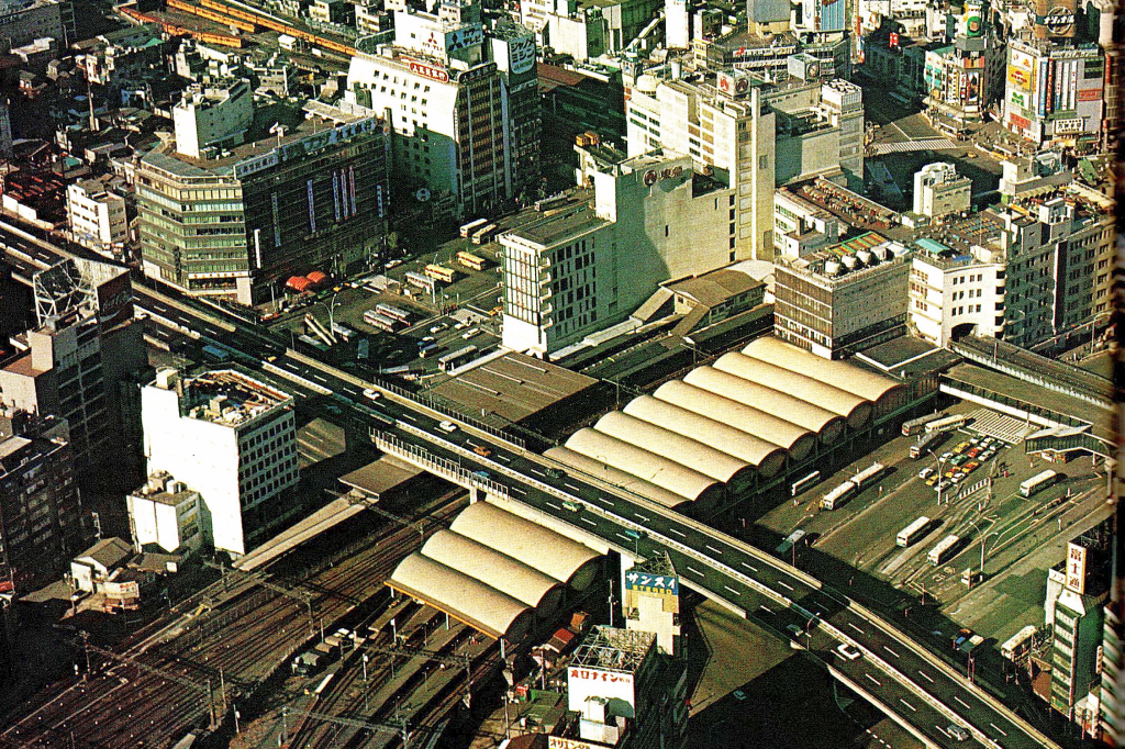 渋谷駅を取り巻くビル群のはじまりは、1954(昭和29)年に完成した東急会館(銀座線の駅や東急百貨店東横店〔西館〕が入っていたビル)だった。以来、東急文化会館(1956/昭和31年)、渋谷地下街(1957/昭和32年)とつづき、1961(昭和36)年には東横線渋谷駅の大改良工事に着手した。この大改良工事とは、連続したアーチ状の屋根を備えた東横線の表玄関・渋谷駅のシンボルでもあった高架駅のことだった。この駅は、昭和の東京オリンピックが開催された年の1964(昭和39)年4月に完成した。