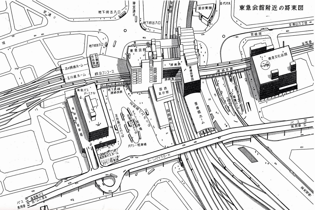 その後も1971(昭和46)年には、渋谷駅を中心とした半径1kmの地域を、1985(昭和60)年を目標に“新都心”として再開発を行うという、「渋谷再開発計画’70」を発表している。これは、すり鉢状の地形の中心部にある渋谷駅をすっぽり覆う「重層化」した人口地盤(巨大な床)をつくり、情報都市空間を形成するという壮大なプロジェクトだった。この計画は実現には至らなかったが、それから49年後となる2013(平成25)年には、東横線の渋谷駅は地下駅へと生まれ変わった。