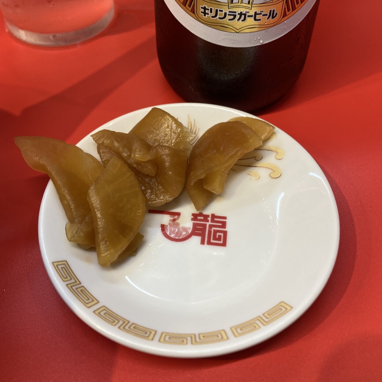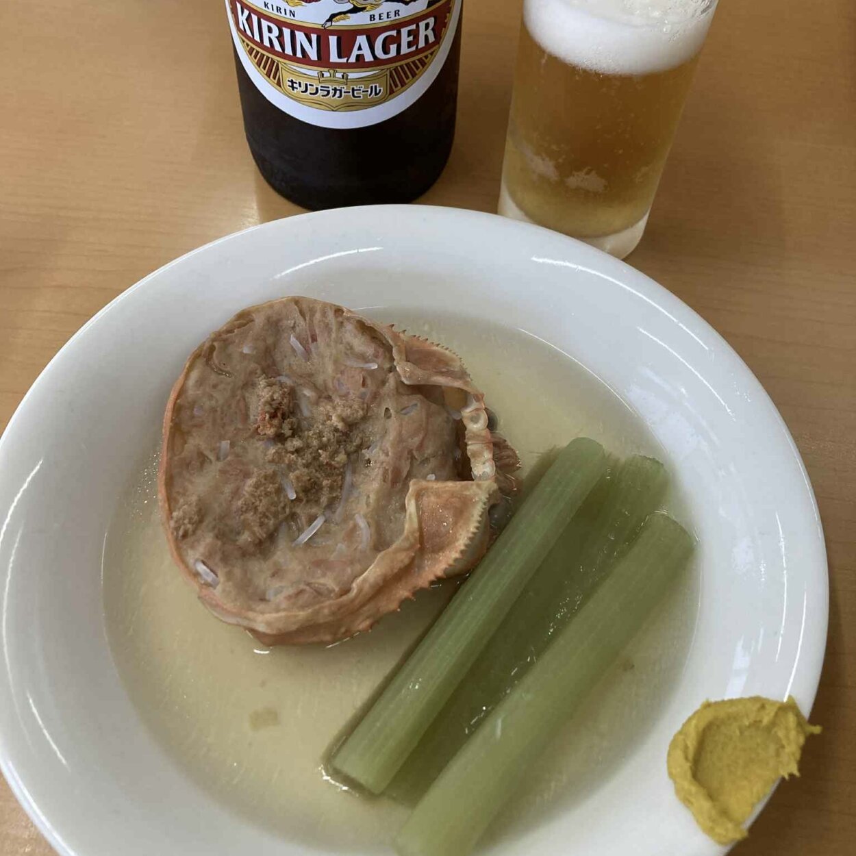 まず、ビールに合わせる食事からご紹介します。同店はラーメンのラインアップ以上に「おでん」の品数が凄いです。いただいたのは「カニ面(カニの甲羅にカニ身の練物が詰められたもの)」と「フキ」です。どちらも出汁がシミシミでビールにめちゃくちゃ合います。