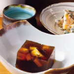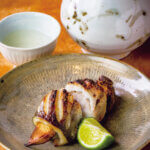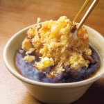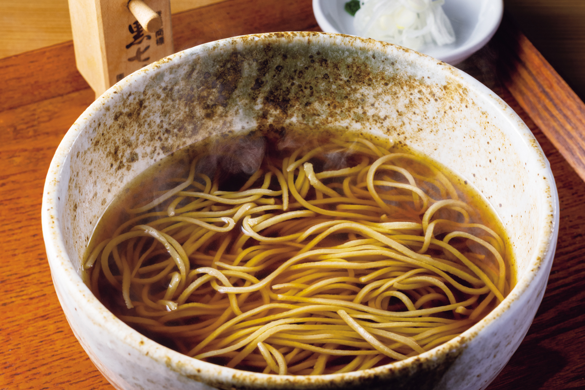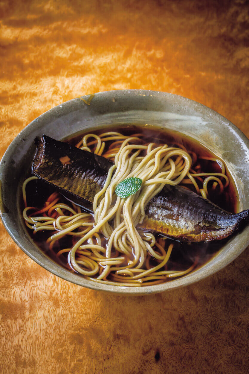 思いを形にすべく主役に選んだ蕎麦は香り高く味が濃厚な栃木・八溝産だ。その玄蕎麦に茨城「常陸秋そば」の丸抜きを合わせ、粗挽きや微粉など挽き方を変えてブレンドする。みずみずしく艶麗な十割はしなやかなのど越しで、じんわり舌に届く穀物香と甘い余韻が実に心地いい。