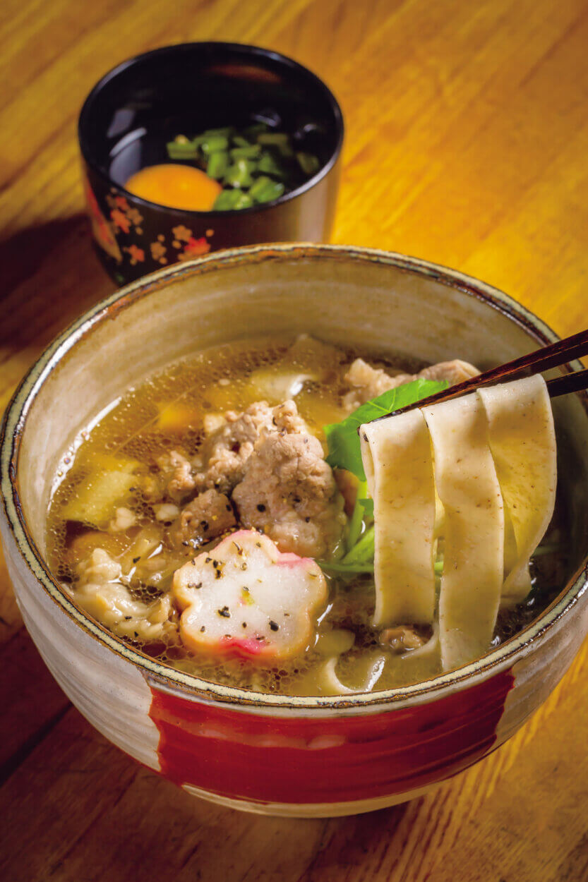 牛焼き煮そば1790円※太蕎麦(限定)に変更+250円・ニラ玉薬味ダレ+350円