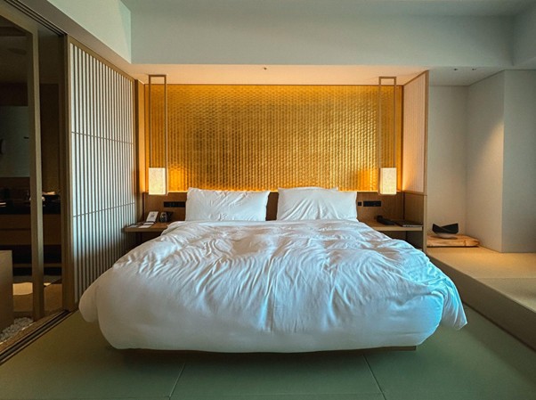 到着すると、正面玄関で、檜などの天然素材で仕上げられた大ヒサシが出迎えてくれた。木のぬくもりを表現したホテルのひとつのシンボルともいえる造形には、誰もが圧倒されるだろう。無理もない。このホテルのデザインに関わった人物の名前を知れば、納得するはずだ。