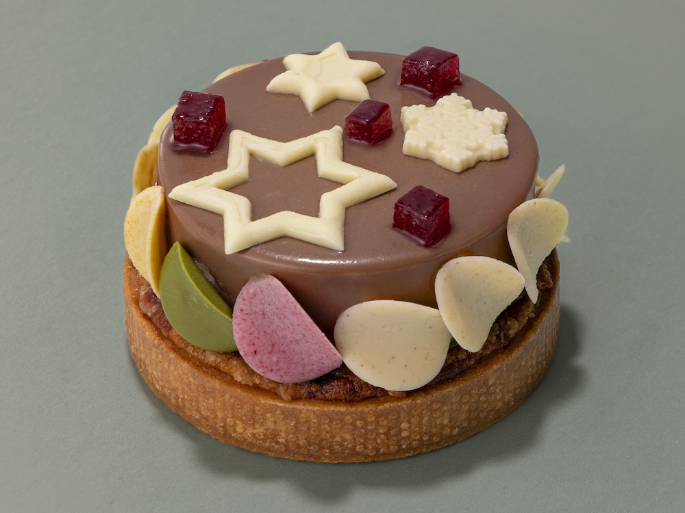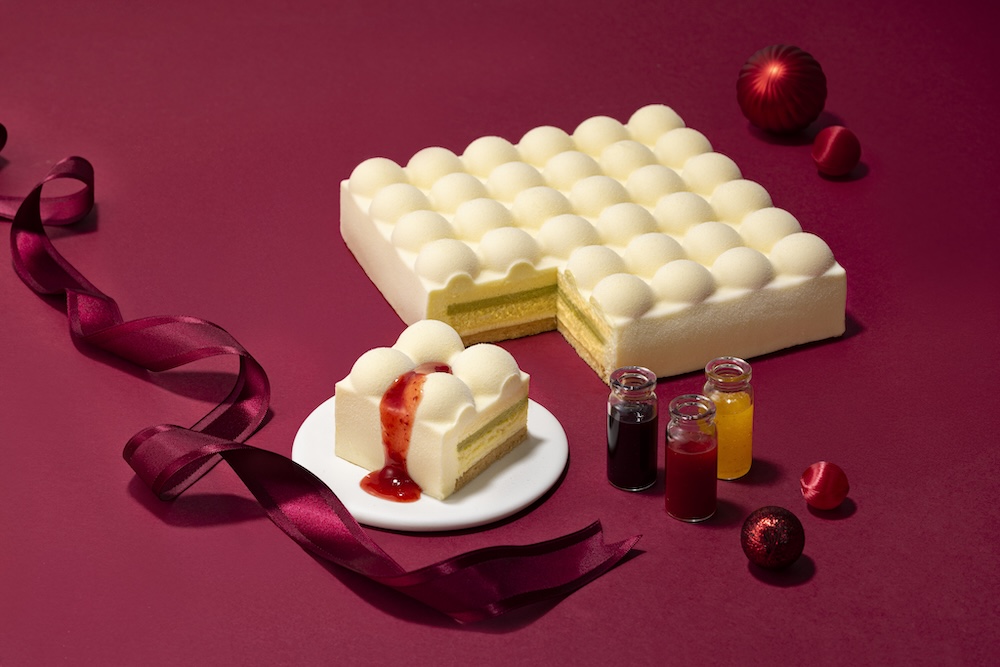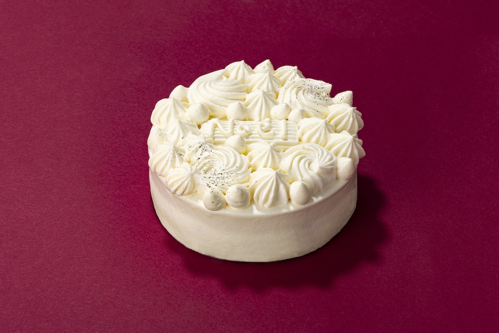 ポコポコとしたユニークな形状が目を引く、特別感あふれる一台。サブレを土台にバニラムース、スポンジ、ピスタチオクリーム、ホワイトチョコムースを重ね、なめらかな口どけに仕上げた。別添の3種フルーツソース(苺・オレンジ・カシス)を好みに合わせてかければ、彩りと味わいの変化が楽しめる。普段はケーキを販売しない東京駅限定のブランドが、クリスマスの期間だけ販売する希少な一台。