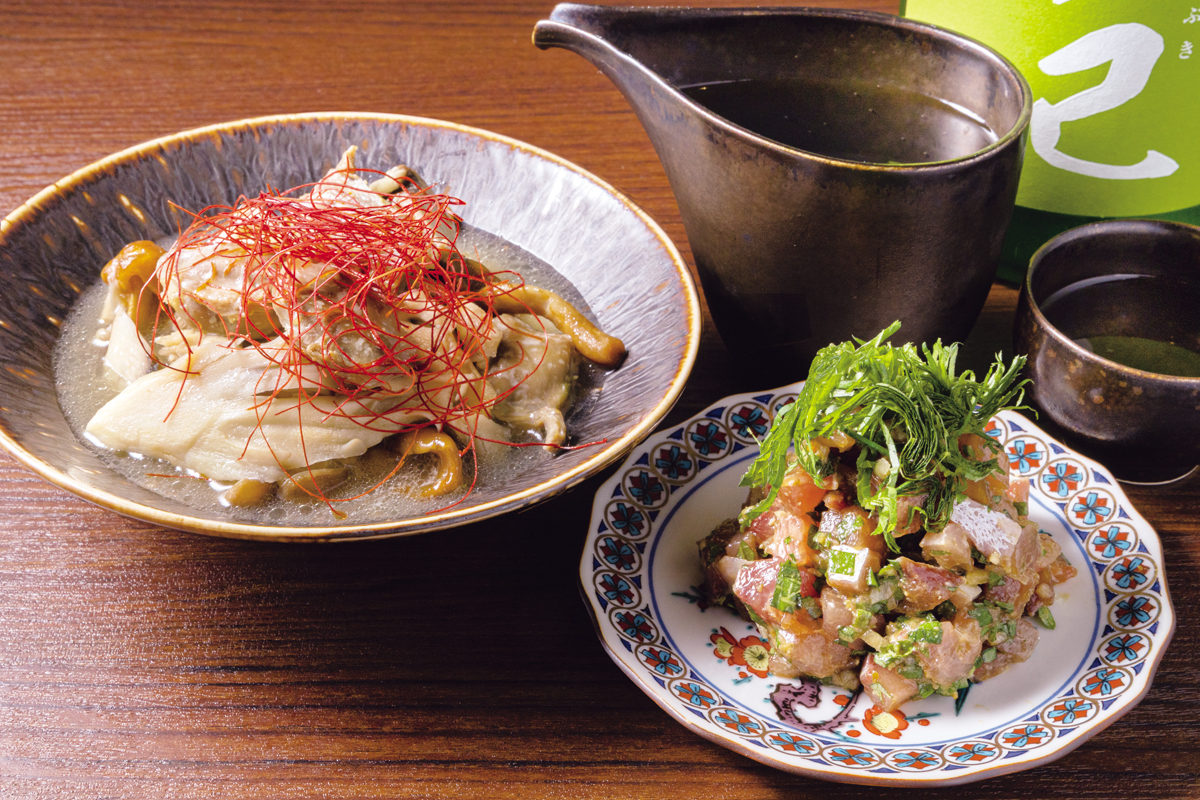 蕎麦前は「いろんな味を楽しんでほしい」(小張勝彦さん)と、蕎麦屋の定番に加え季節メニューも用意。それに合わせたい日本酒や焼酎などのお酒は「蕎麦の邪魔をしない、おだやかな味わい、香りのものをメインに揃えています」。すべてのこだわりは風味豊かな蕎麦のために。
