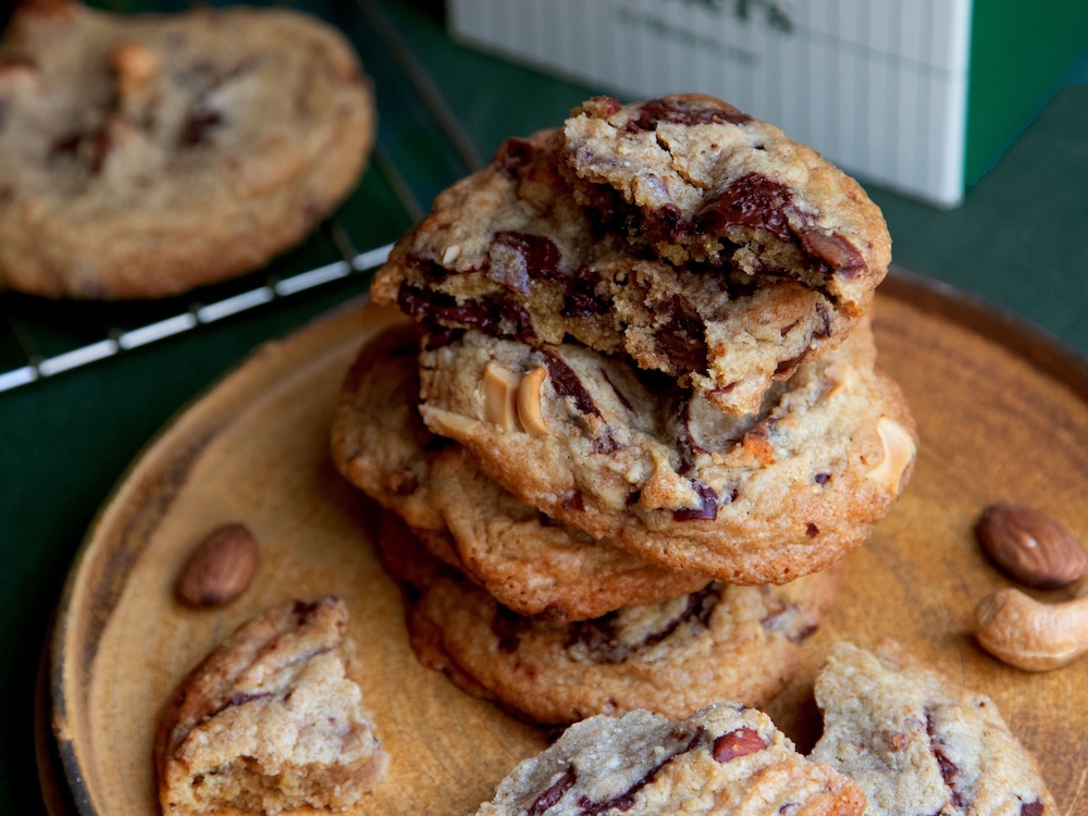 全粒粉を使用した味わい深い生地に、ほどよい甘さのチョコレートとたっぷりのアーモンドとカシューナッツを贅沢に混ぜ込んだ。しっかり満足できるサイズ感で、外はザクッと、中はしっとりとした、アメリカンスタイルのクッキー。