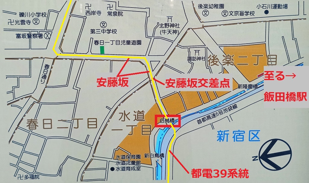 1968(昭和43)年までは、この橋の上を都電39系統(早稲田停留場~厩橋停留場)が走っていた。この都電(冨坂線)は、橋を渡ると「安藤坂」という66.7‰(パーミル/1キロ進んで66・7mの高低差がある)の坂をのぼって、春日通り(国道254号線)へと向かう路線だった。