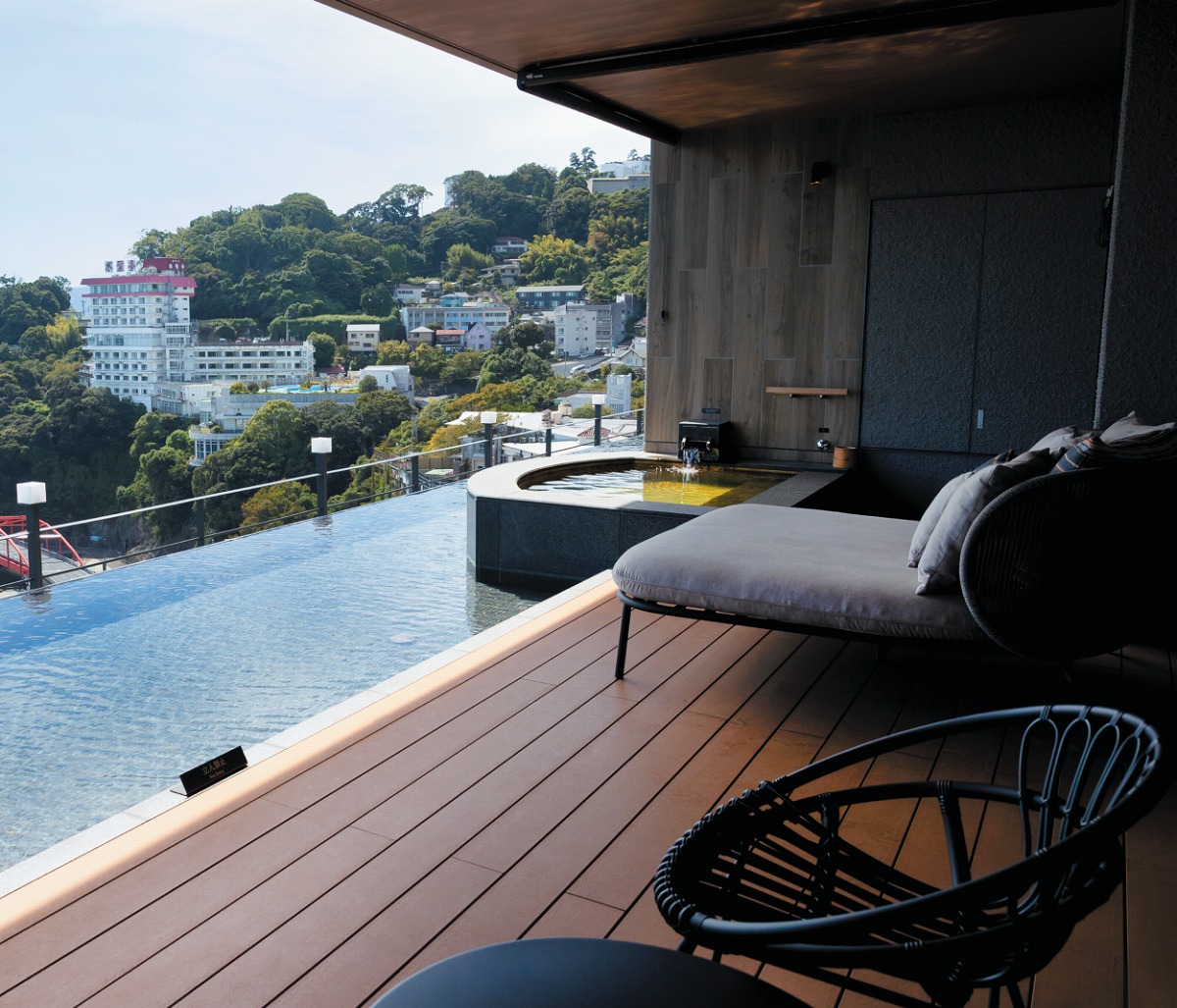 熱海駅から車で7分ほどの伊豆山エリアは、すぐ近くに温泉街のにぎわいがあるとは思えない静けさがゲストに人気の一角だ。正面に初島や大島を望む宿はオーシャンビューのロケーションが見事。最上階のラウンジやロビー、客室、さらには大浴場などでは水平線が視界いっぱいに広がり、非日常感に浸れる。