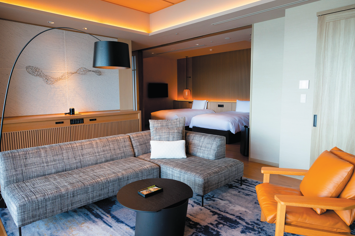 客室は全室露天風呂付き。スイートの2室はテラスに水盤があり、張り出すようにしつらえられた露天風呂とともにインフィニティな感覚を部屋にいながら味わえる。居室はリビングも広く、新しい「和」の創造をコンセプトに整えられたインテリアやアートにも心癒される。