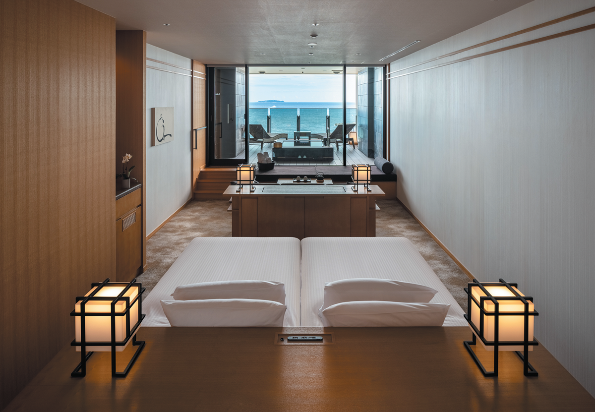 海側の露天風呂付き客室、デラックスオーシャンビュー“ROTEN”。海に向かってベッドが据えられ、寝転びながら景色を眺めるのが心地いい。
