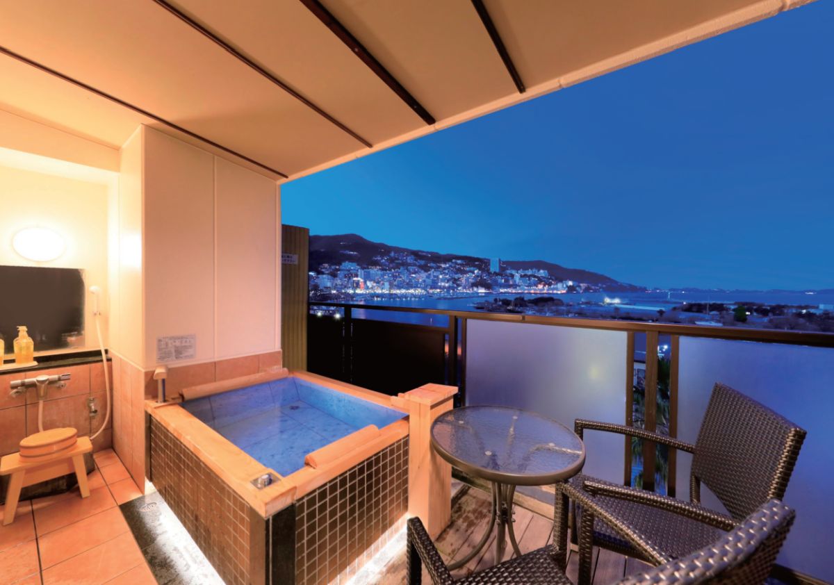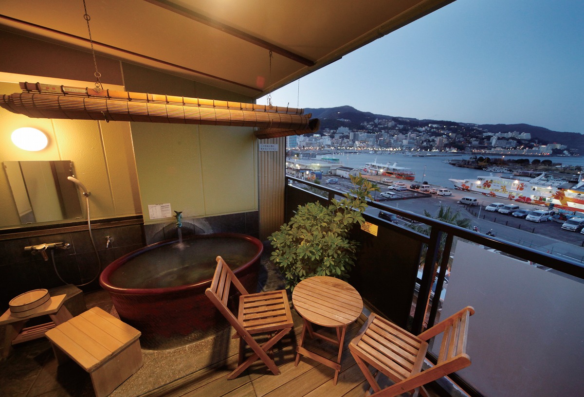 館内は「花秀館」と「花風館」の2館があり、どちらにも露天風呂付き客室が備わる。「花風館」には、間取りや湯船が異なる3種の和室があり、計9室を用意。どの部屋からも熱海市街や湾の眺めを楽しめる。