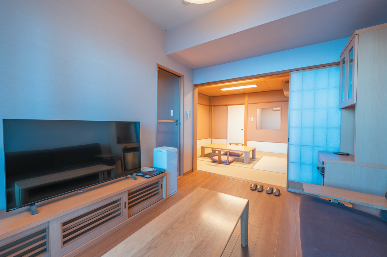 別館の和洋室は3室あり58平方メートルの広さ。それぞれの露天風呂やバルコニーから海の景色を楽しめる。同じ間取りは123号室、122号室は少し異なる造り。ペット同伴可の洋室も3室用意。
