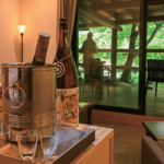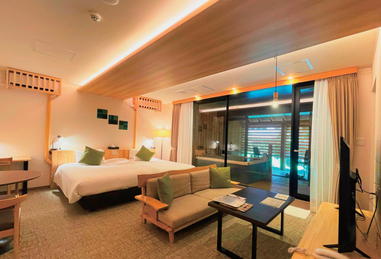 デラックスツインルーム。客室内とは思えない廊下の先に、風情ある和室と大きなガラス窓の奥に木々の緑が鮮やかなベッドルーム、露天風呂が連なる。布団を敷き、4名まで利用可能。