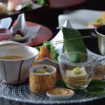 全9室の客室は畳敷きのモダンな和室で、すべてに露天風呂か半露天風呂が付く。部屋名に「五条」「御池」といった京都の地名が付けられ、また朝食は京都のおばんざい風に仕立てるなど、コンセプトに沿ったこだわりが光る。食事は夕朝とも囲炉裏を囲んで。ここならではのもてなしが詰まった「温泉旅」を楽しみたい。