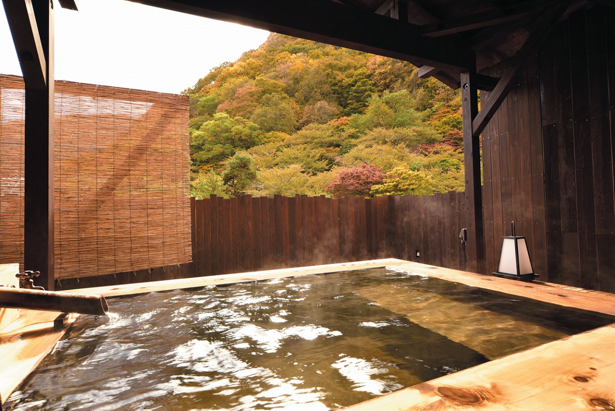 川の瀬から湯が湧き出たという由来を持ち「美人の湯」と評判の自家源泉は、館内に備わる開放的な大浴場や渓流を望む露天風呂、客室の湯船などに豊富にかけ流されている。なかでも大浴場は、四季折々の景色を楽しめる当館メインの湯処だ。