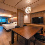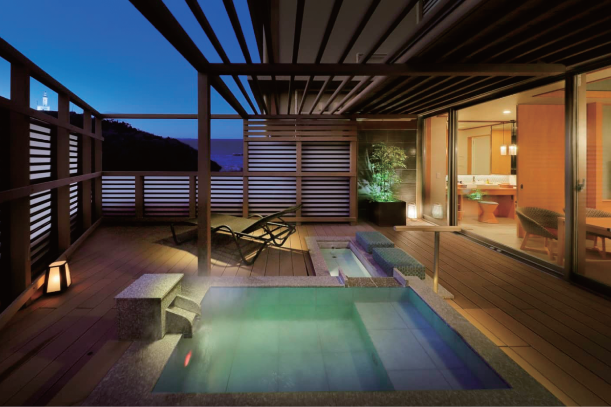 12畳の和室+ツインベッドルーム+リビングの造り。展望デッキテラスには源泉かけ流しの露天風呂を完備。露天風呂付き客室は、タイプや料金が異なる28室が備わる。人数や予算に応じて選択が可能。