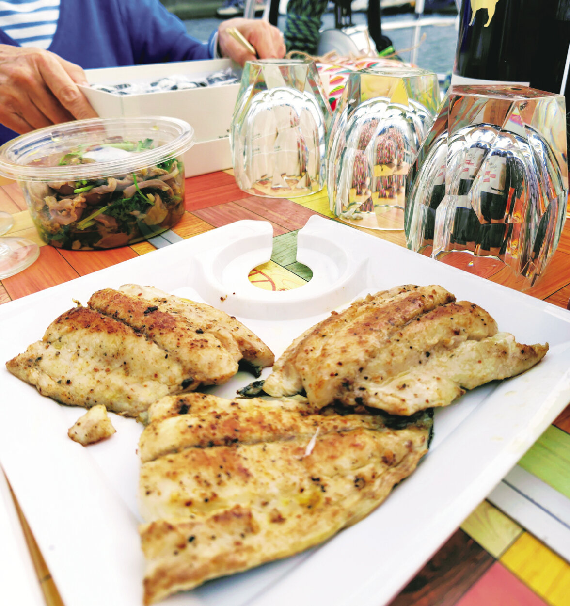 ×日:江の島からヨットで沖に出てみましたら、ケンケン(曳き釣りをする道具)にシイラがかかったよ(ハワイで言うマヒマヒです)。美しい色!すぐに船上で捌いて、ほりにしを振りかけて、船のコンロでソテーします。釣りたての旨さは、なんといいますか、いただきます!と神妙に手を合わせる気持ち。