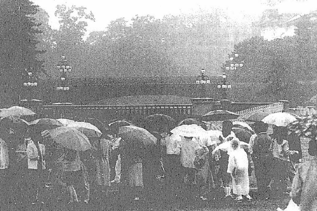 その後、1951(昭和26)年の参賀では、昭和天皇と香淳皇后がそろって宮内庁庁舎に設けられたバルコニーへお出ましになるようになった。このバルコニーへのお出ましは、1950(昭和25)年に昭和天皇がはじめられたもので、1954(昭和29)年には38万1250人もの人々が祝賀に訪れたという。その群衆は、両陛下をひと目見ようと宮内庁の庁舎前で立ち止まり、続々と押し寄せる人波に押される形で二重橋(石橋)上で死者16人を出す痛ましい事故も起きている。