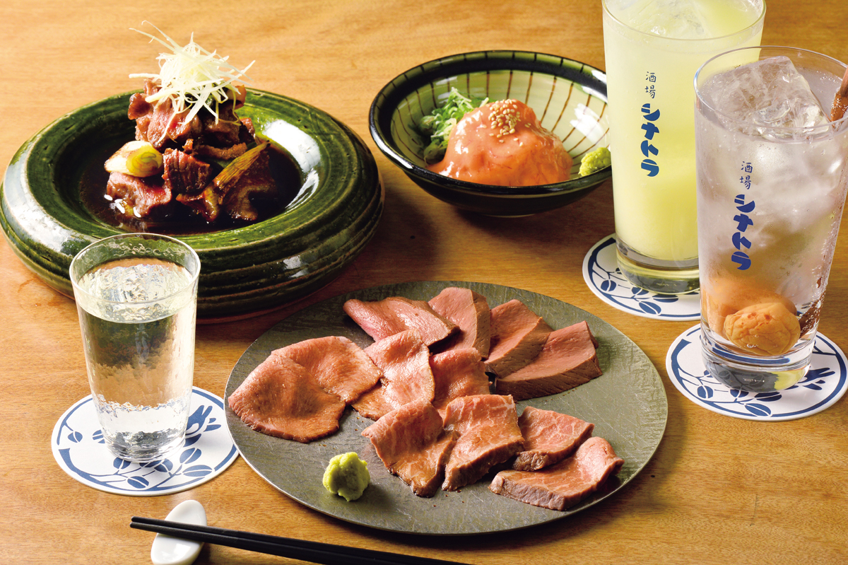 まず目指すべきは『酒場 シナトラ』だ。理由は明快、揃いも揃った佳肴たち。そんな品書きのトップを飾るのが桃色に艶めく牛刺しだ。モモやハツ、タンを塊ごと低温調理して、舌を撫でるしっとり感が官能的。